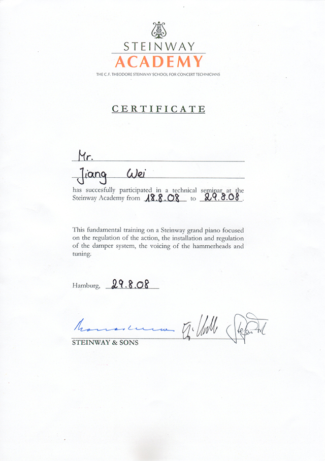 家調(diào)音,獲得廣泛的贊譽,曾連續(xù)3屆擔任中國國際鋼琴比賽的專家技師。現(xiàn)任廈門音樂家協(xié)會鋼琴調(diào)律