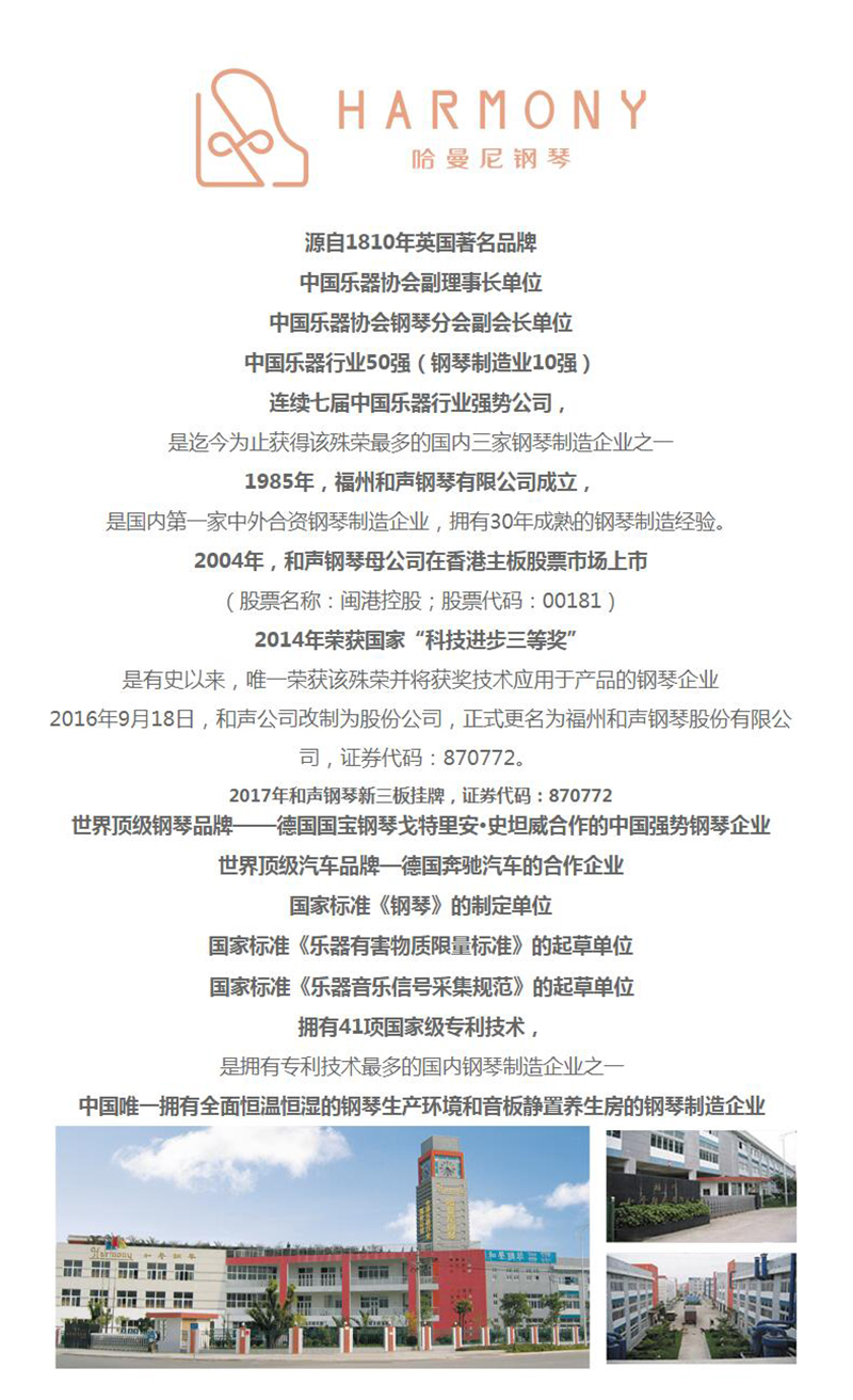 1985年,福州和聲鋼琴有限公司成立,是國內早期中外合資鋼琴制造企業,生產源自1810年的英國品牌哈曼尼(Harmony),